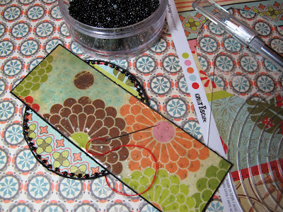 Step 10) The glassy Cuttlebug piece is mounted on black cardstock & then a circle (cut from the same patterned paper in the Studio Calico kit.) Then, it's stitched with black seed beads and red thread.